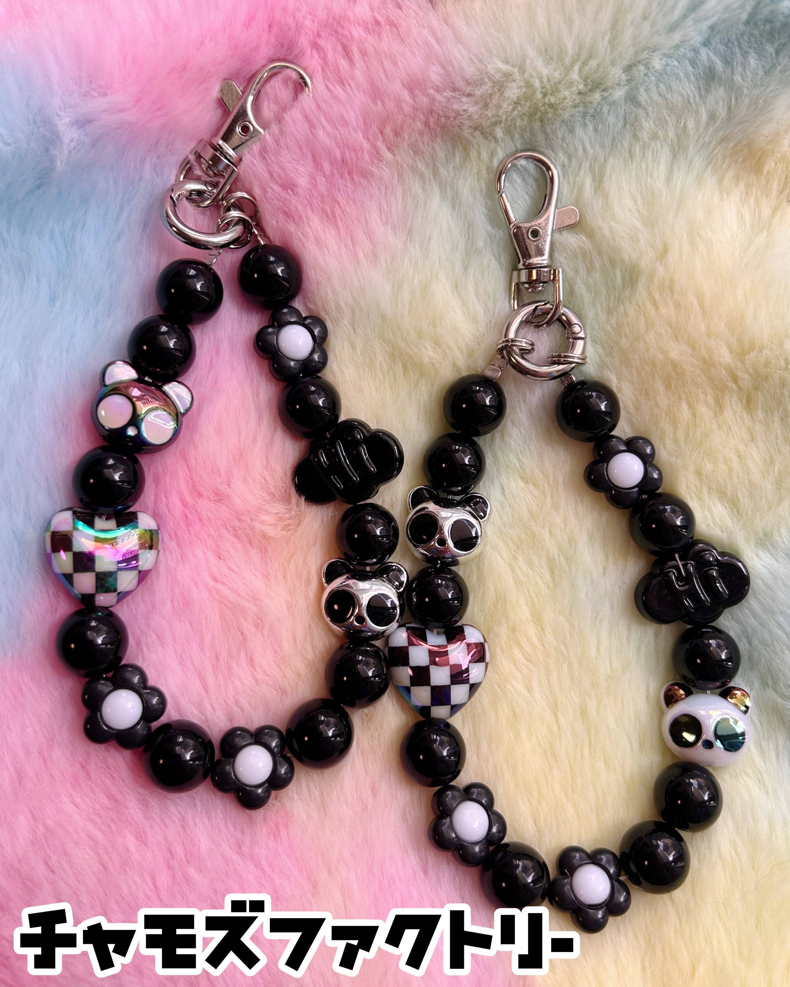 ブラックビーズにパンダモチーフとチェッカーハートを組み合わせた、