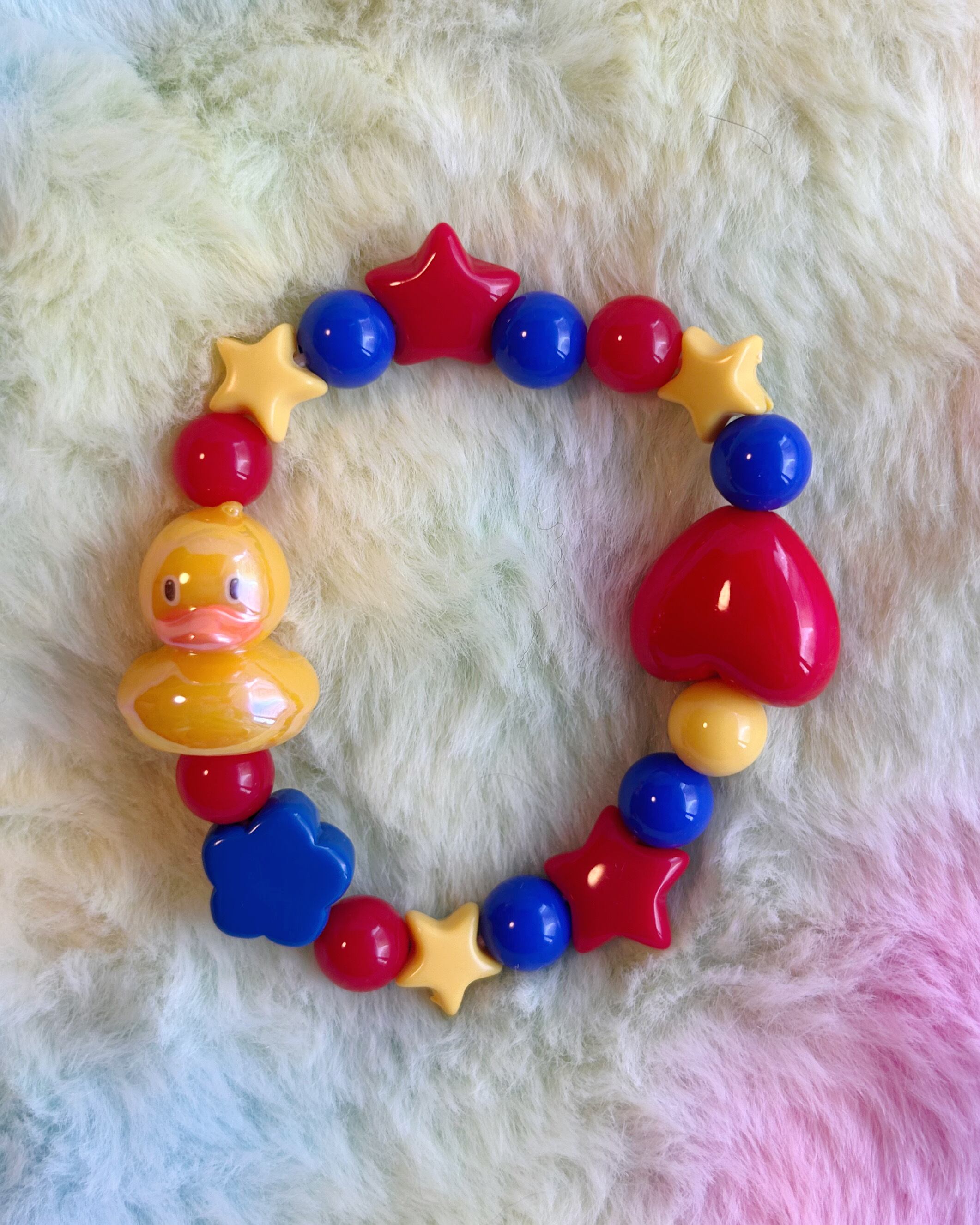 ポップな赤・青・イエローをベースに、星やハート、つやっとしたアヒルモチーフを組み合わせた、にぎやかで楽しいゴムブレスレットです。