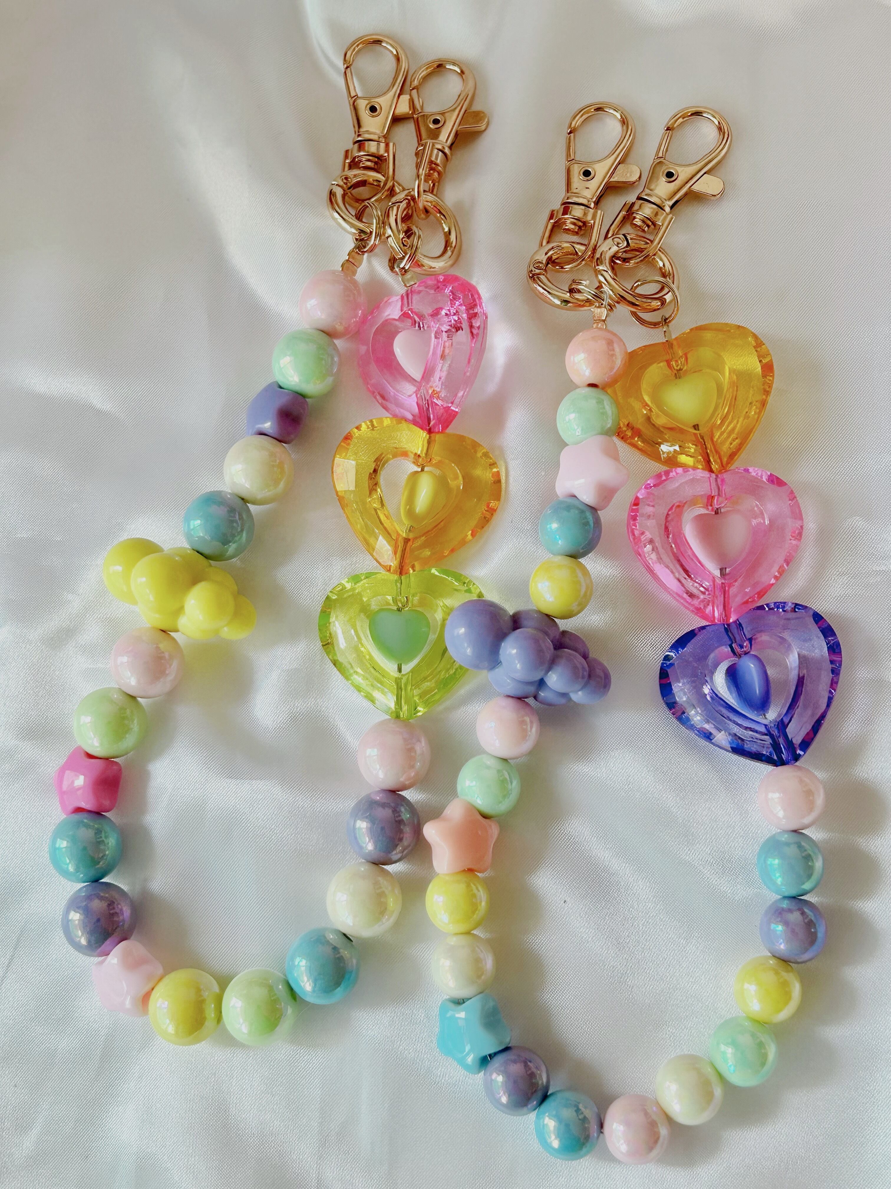 パステルオーロラのビーズに大きなキラキラハートがアクセント、金具を付け替えてカバンやポーチの飾りに付けたり、ループタイプのスマホケースに取り付けてハンドストラップとしてもお使い頂けます⭐︎