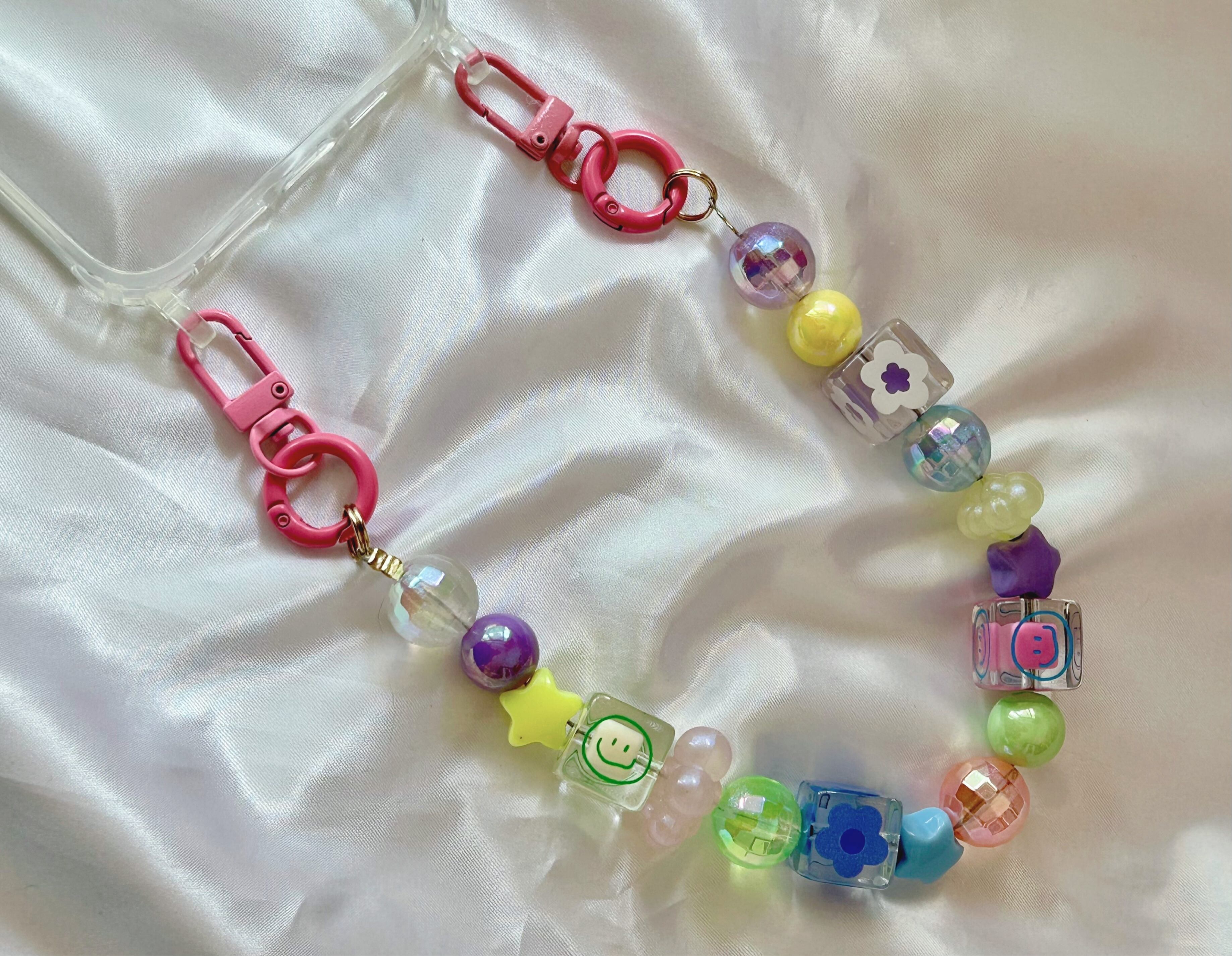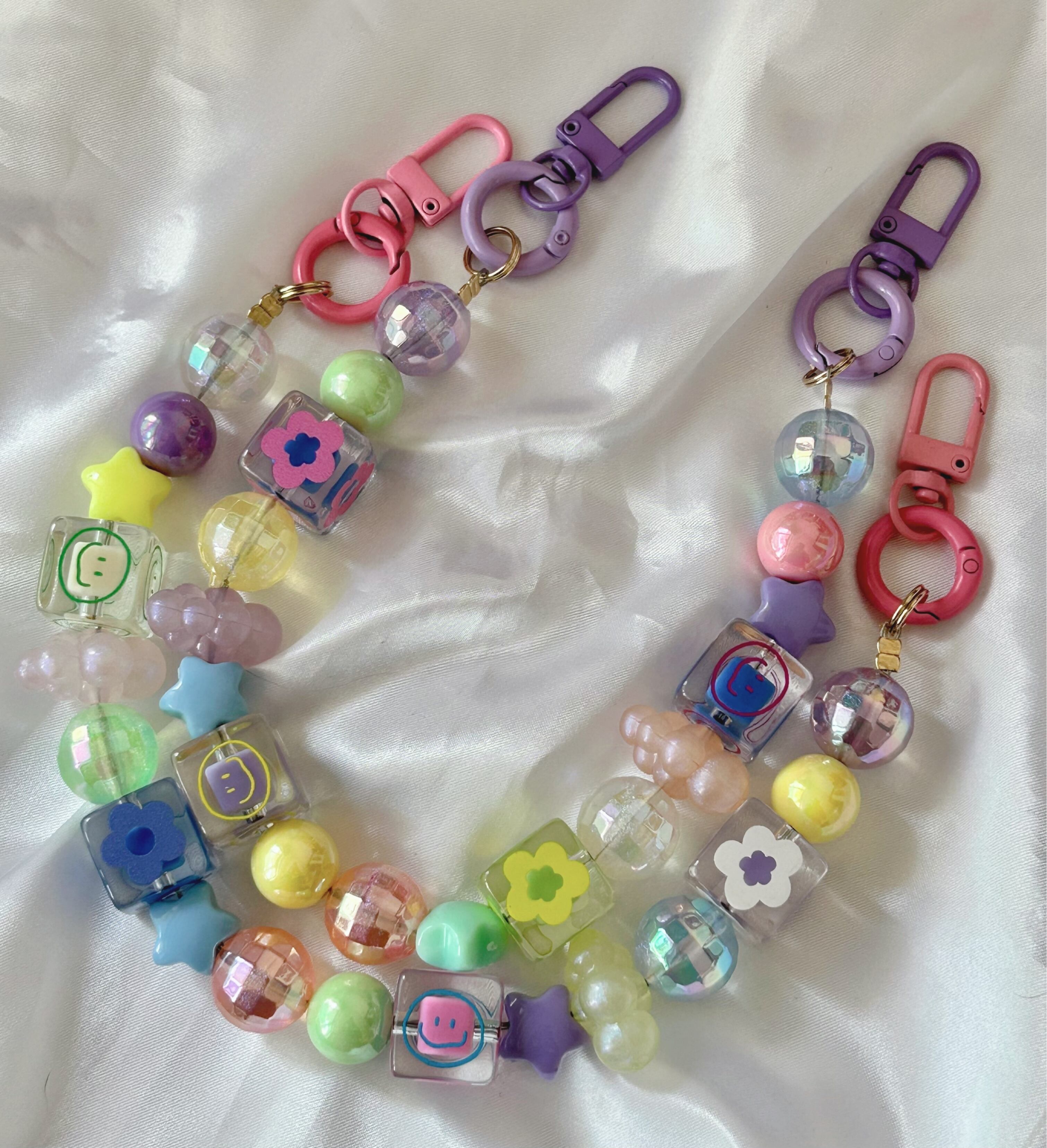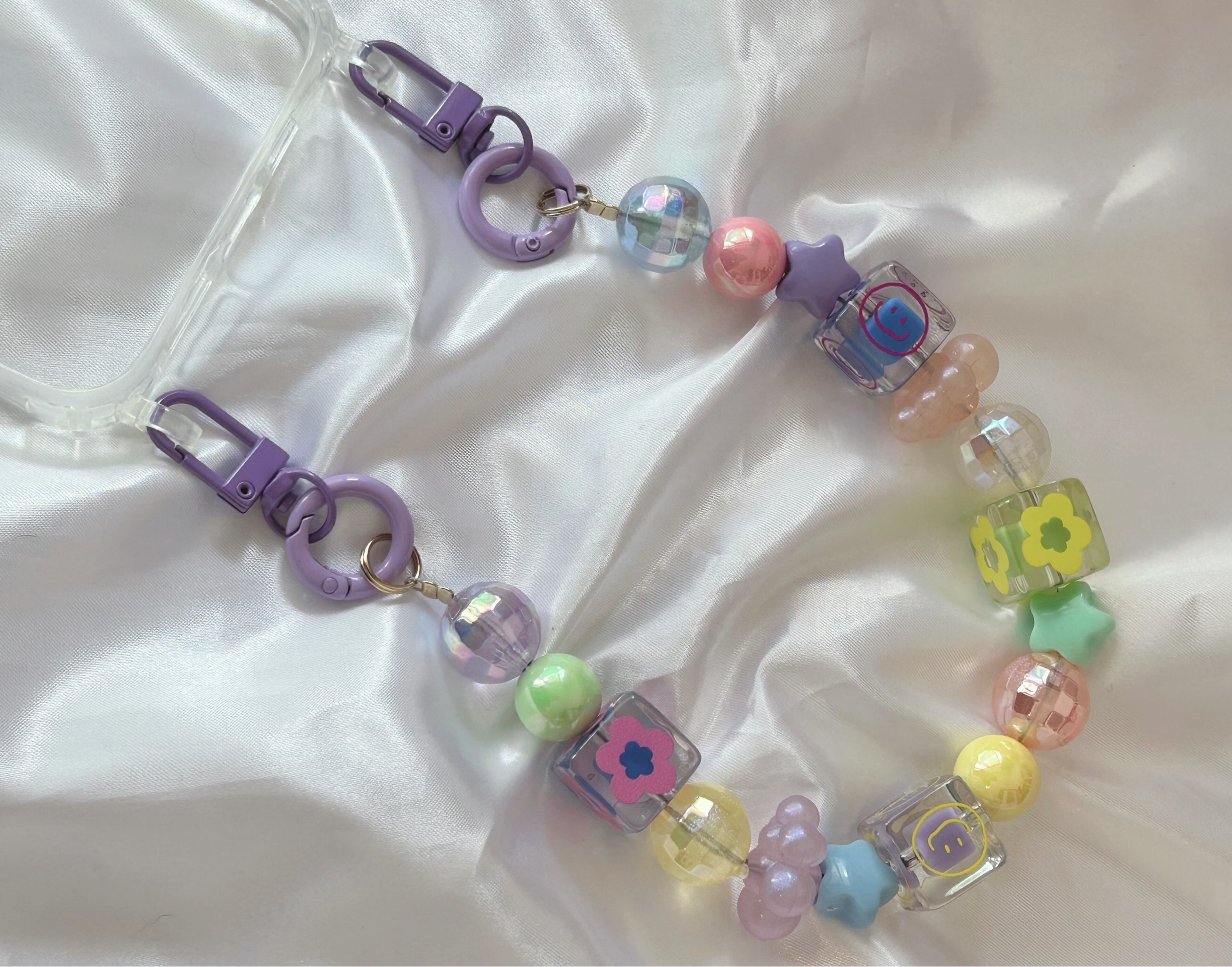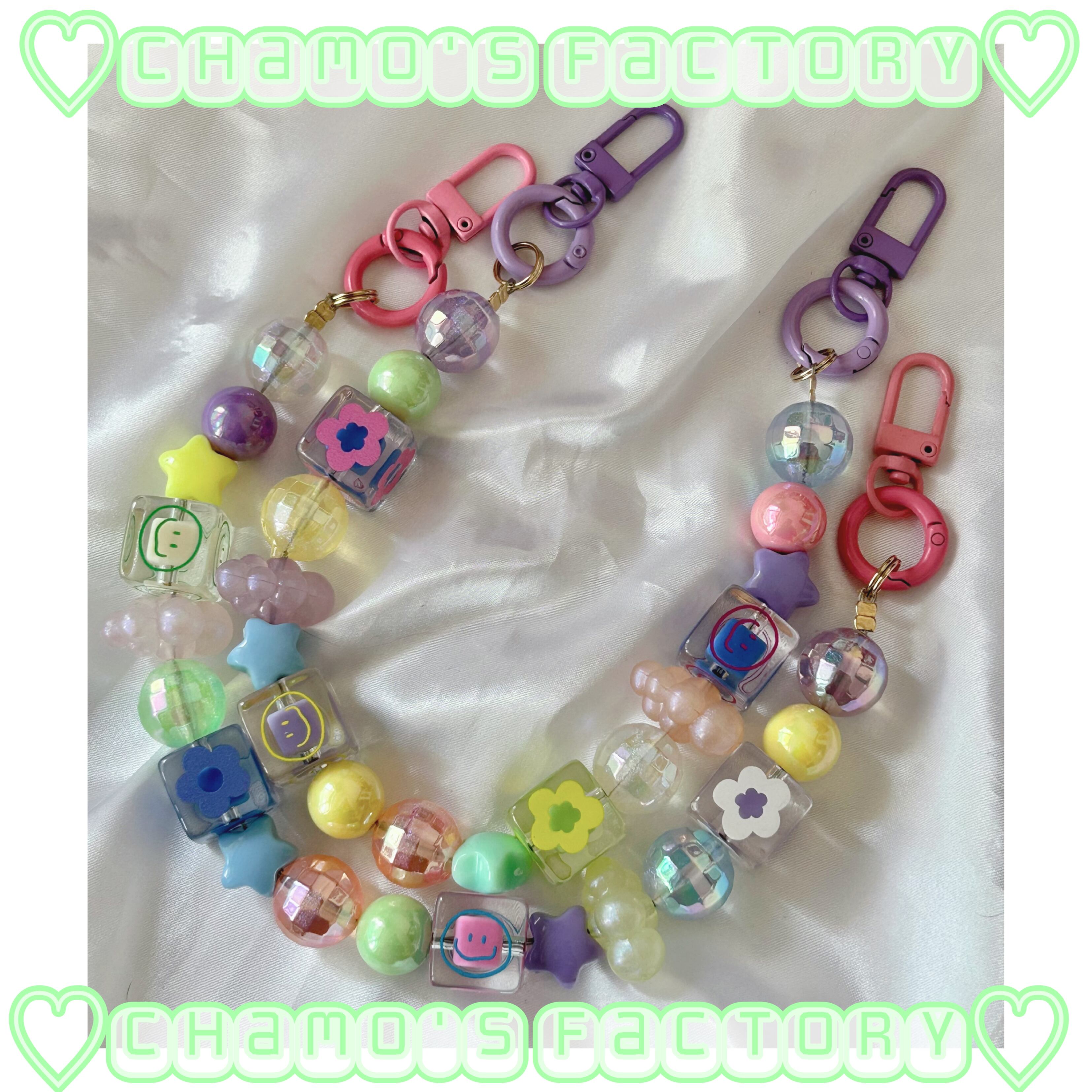 ニコちゃんやお花のビーズ、オーロラのミラーボールのビーズ、可愛いを沢山詰め込んだストラップをお作りしました☺︎金具を付け替えて色々な形で使用する事ができ、ストラップにしたり、スマホケースに取り付けてハンドバッグの様に持つ事も出来ます♡